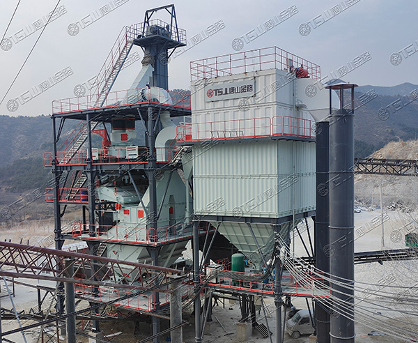 原料經(jīng)過電子秤進入到皮帶輸送機中,由全封閉的提升機將物料入到五孔碾磨制砂機內(nèi)進行破碎處理,再由空氣篩對破碎后的物料進行篩分、選粉處理,篩分后的較大物料會返回五孔碾磨制砂機中進行二次破碎,符合要求的砂子則由傳送帶輸送至成品倉中;篩分過程中的粉塵會經(jīng)粗細粉分離機進入到布袋收塵器內(nèi),而其中較大的粗顆粒會在粗細粉分離機的作用下,按需求在成品砂中進行回摻,細粉塵將通過風力進入到布袋收塵器,作為副產(chǎn)品進行使用。