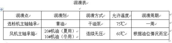 在日常運(yùn)行中,應(yīng)保證各潤滑點(diǎn)充分潤滑,并定期對粉分離器內(nèi)軸承和風(fēng)機(jī)軸承進(jìn)行潤滑(見下表)。在日常維護(hù)中,注意粉體分離器轉(zhuǎn)子的平衡。如發(fā)現(xiàn)異常振動(dòng),應(yīng)立即停機(jī)檢查原因,并可在運(yùn)行前繼續(xù)故障。
